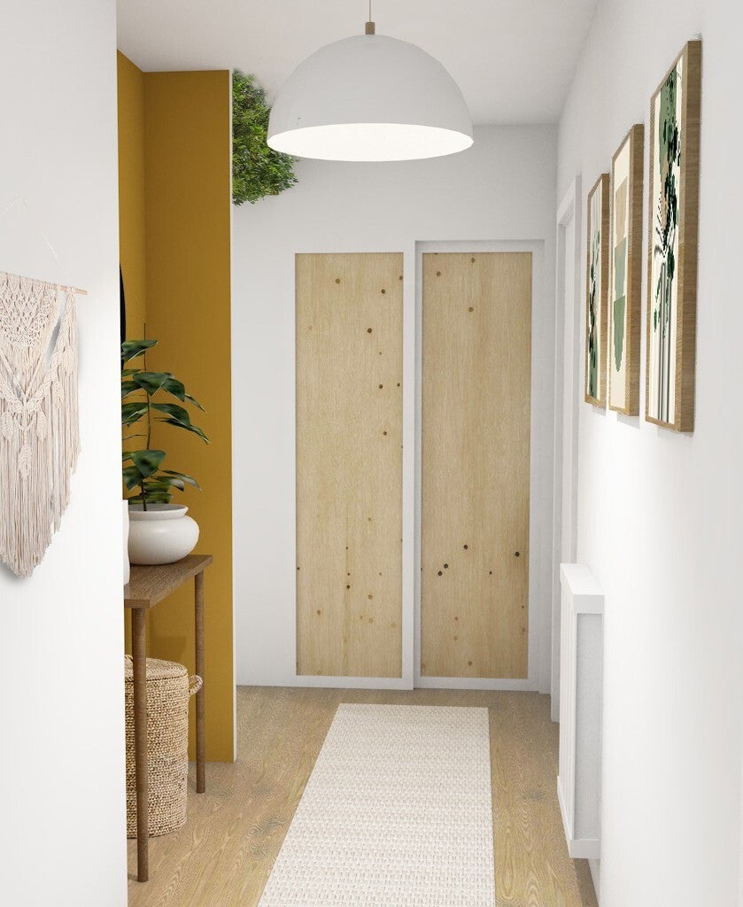 L’espace reculé dans le couloir est utilisé pour l’emplacement de la console existante et accentué d'un ton ocre. L’idée de banquette dans l’entrée a été conservée et installée en enfilade avec le nouveau meuble/coffre pour le stockage de nourriture. On retrouve également la couleur ocre sur le mur d’entrée pour réchauffer l’espace.