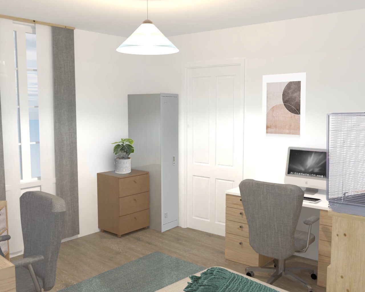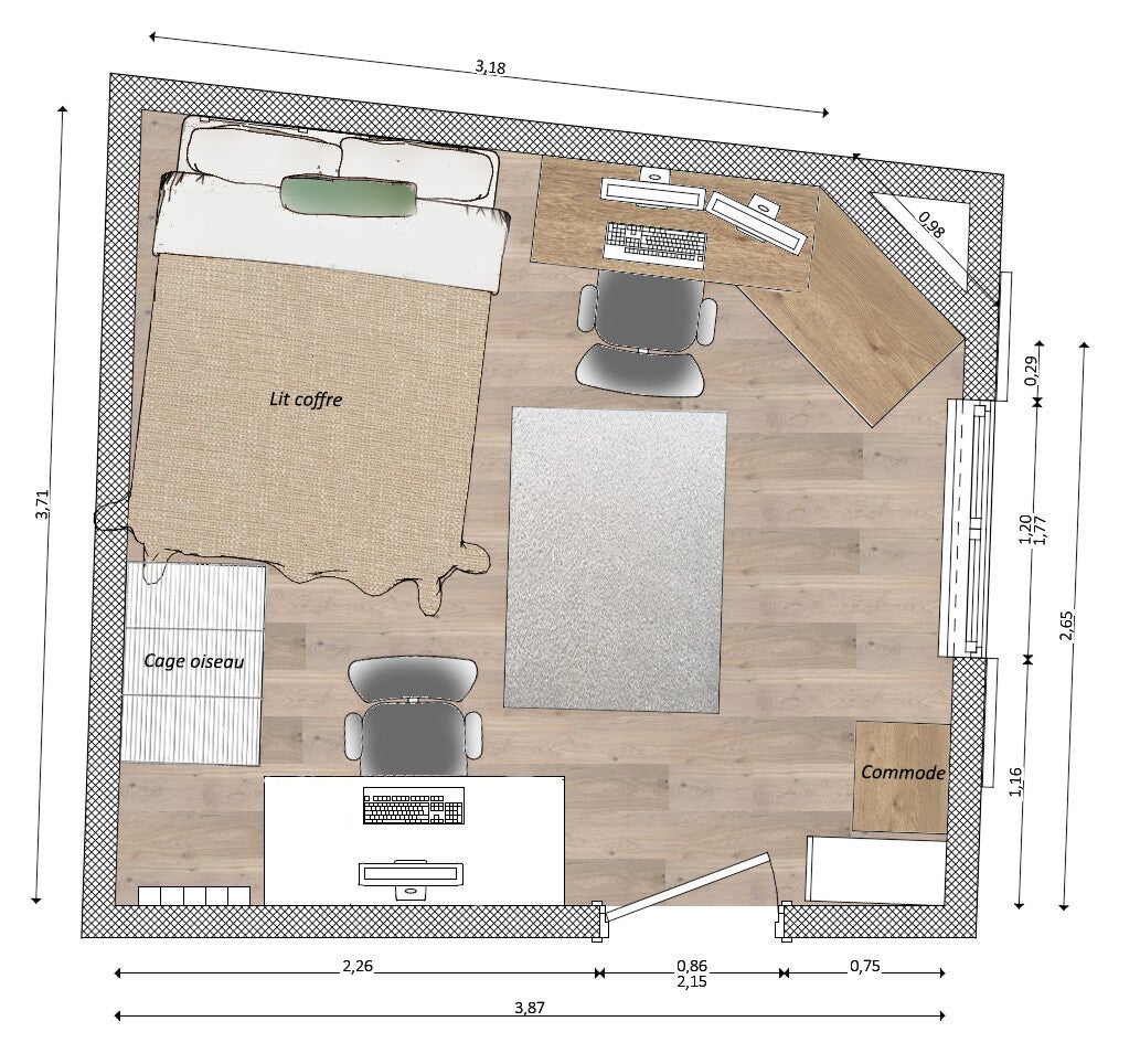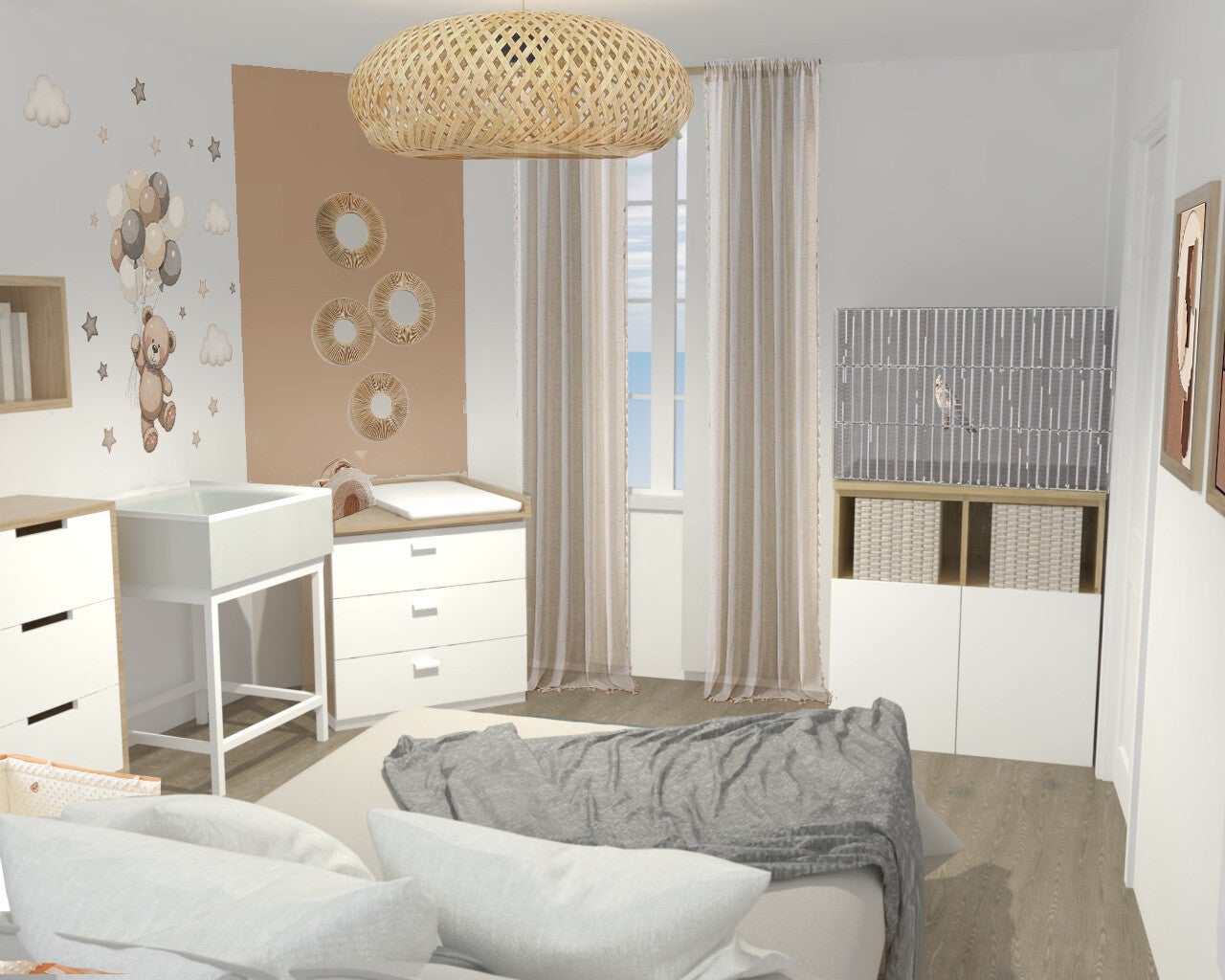 Les clients souhaitaient une ambiance cocooning, chaude et apaisante pour la venue du bébé. L’espace doit être fonctionnel, aéré et pratique. La surface de la chambre faisant tout de même 13m², cela nous permet d’amener le mobilier nécessaire pour le bébé, mais aussi de créer du rangement (penderie, commode). A la demande du client, nous avons pu conserver la cage à oiseau.