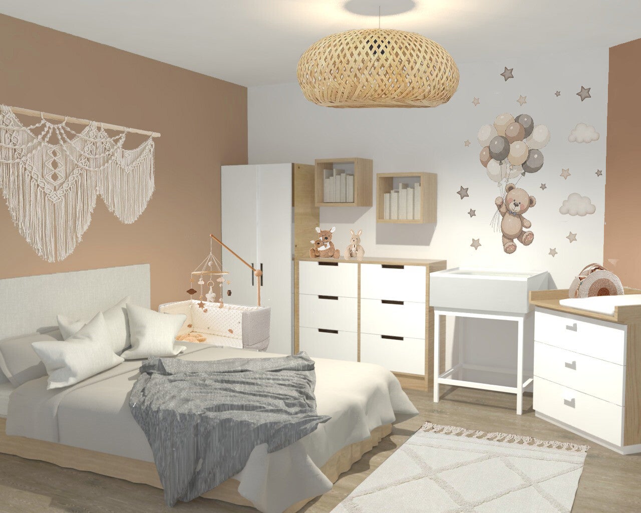 Le mobilier en bois clair et blanc permet d’adoucir, à la différence de la tête de lit dans les tons Terracotta qui réchauffe la pièce. Les éléments textiles comme les tapis et les rideaux permettent d’appuyer l’idée de chaleur et de cocooning.